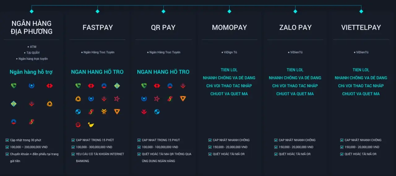 - Cung cấp nhiều phương thức nạp tiền như thẻ ngân hàng, ví điện tử, USDT để tiện lợi cho bạn.